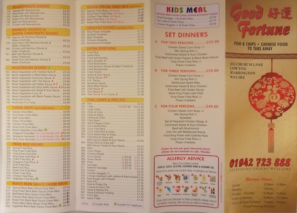 Located in the charming Lowton area of Warrington, Good Fortune Fish & Chips stands out not only for its exceptional food but also for its welcoming atmosphere. The shop embraces a casual vibe, making it an excellent spot to unwind and enjoy a hearty meal. With tables available for dine-in, patrons can relish their favorites in a comfortable setting. The exterior, simple yet inviting, draws in both locals and visitors alike. , Customers often comment on the friendly staff, which adds to the overall pleasant experience. Just a stone's throw from the bustling community center, this takeaway offers free parking in a lot, making it even more accessible for diners. Whether stopping by after a long day at work or grabbing a late-night snack, this place delivers satisfaction in every bite.